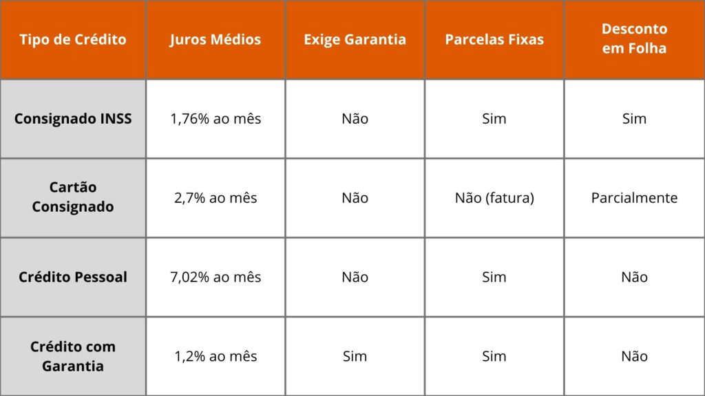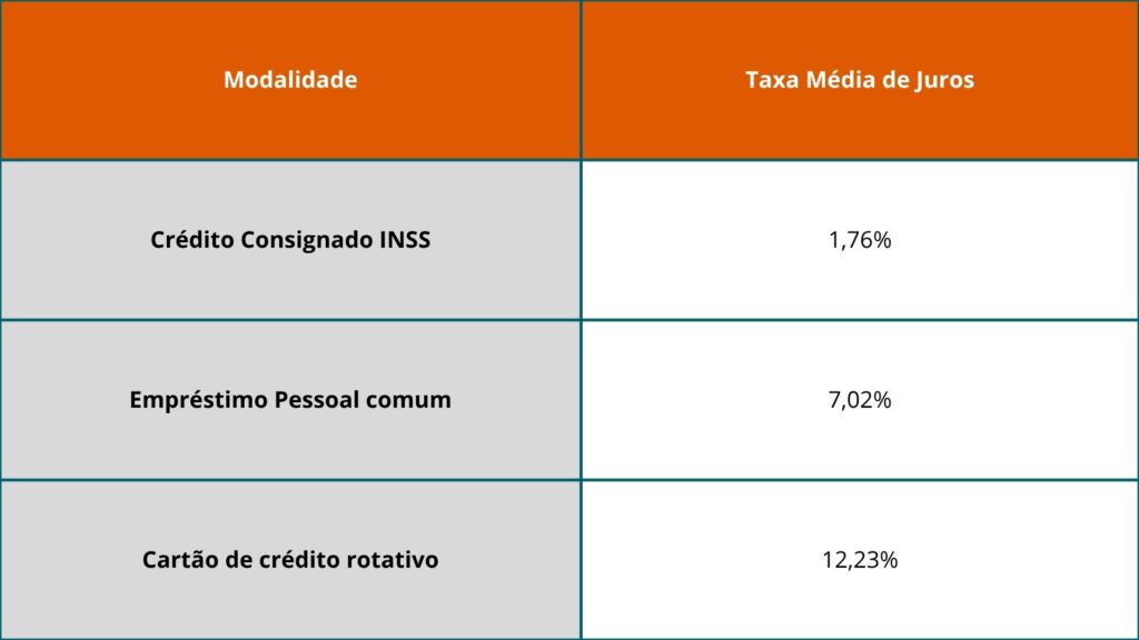 Segundo dados do Banco Central (https://www.bcb.gov.br/estabilidadefinanceira/taxasjuros), o crédito consignado apresenta uma das menores taxas de juros do mercado. Enquanto um empréstimo pessoal pode ultrapassar 7% ao mês, o consignado para beneficiários do INSS tem taxas médias de 1,76% ao mês (dados de 2024).